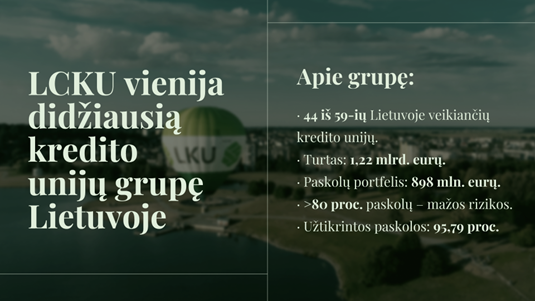 LKU kredito unijų grupė per devynis šių metų mėnesius išlaikė tvirtą augimo tempą ir toliau nuosekliai didino finansavimo apimtis gyventojams bei verslui. LKU grupę sudaro 44 kredito unijos ir jas prižiūrinti Lietuvos centrinė kredito unija (LCKU).